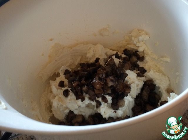 • Смешиваем творожный (любой мягкий) сыр, тертый пармезан, луковый порошок, черный перец. Добавляем туда обжаренные грибы (когда немного остынут). Если нет лукового порошка, то лук мелко-мелко порезать и обжарить с грибами и чесноком. Получается очень густо.
