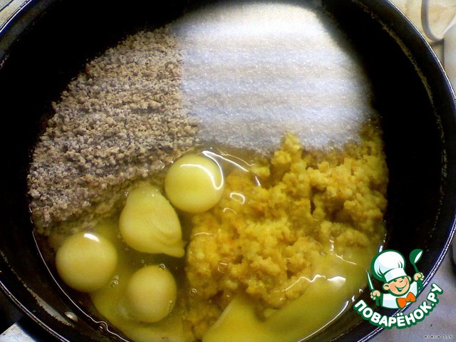 Смешать апельсиновую и миндальную массу, добавить яйца, сахар и разрыхлитель.