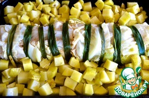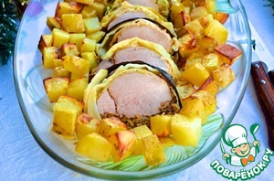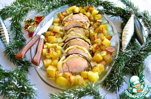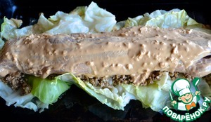6. Выложить 2/3 листьев капусты с нахлестом одним пластом, накрыть слоем грибной массы, сверху положить вырезку, хорошенько промазанную маринадом. Накрыть оставшимися листами капусты, закрепить лентами зеленого лука. (Зачастую лук рвется. В таком случае, при необходимости, перевяжите карбонад в листьях кулинарной нитью).