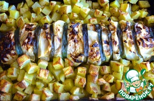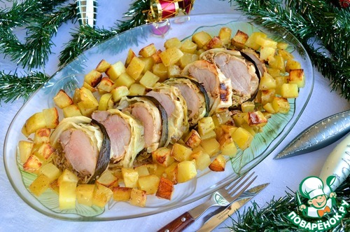 7. Картофель нарезать кубиками, выложить в миску, посолить, поперчить и щедро полить оливковым маслом. Выложить карбонад на середину противня, с двух сторон положить кубики картофеля и запекать 40-45 минут при температуре 220С.