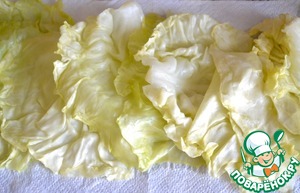 2. Капусту опустить в кипяток на две минуты, снять верхние листья, отправить обратно в кипяток и снять новые обмякшие листья. Повторить с оставшейся капустой. Обсушить капустные листья на бумажных салфетках. Перья зеленого лука обдать кипятком.