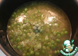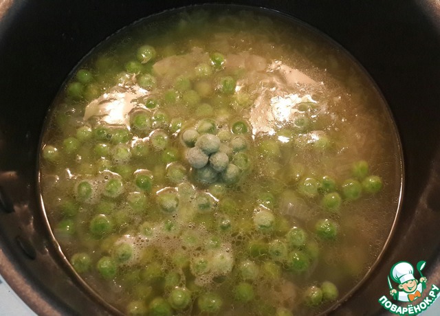 Добавить горошек (горсть горошка оставить для украшения), оставшийся бульон и довести до кипения. Проварить 10 мин.