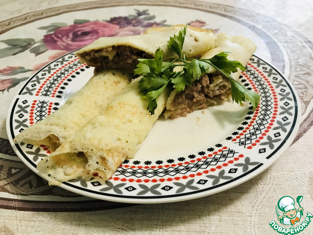 Блины на молоке с начинкой из тунца, сыра, перца чили и зелёного лука.