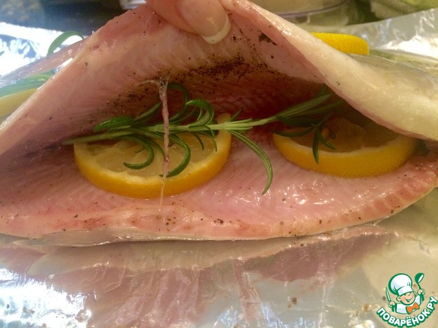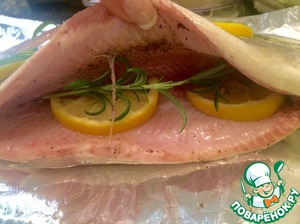 Всё до безумия просто: на двойной слой фольги, чтобы потом модно было плотно завернуть в колбаску со швом наверху, берем нашу рыбку, натираем солью-перцем, сверху кладем лимон и розмарин.