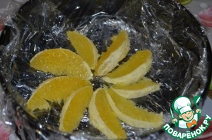 Апельсин разделить на дольки, разложить в ту же форму, где пекся бисквит.