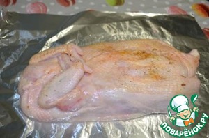 Аккуратно завернуть фольгу, переложить на противень, куда налить немного воды. Поставить в духовку на 1час.