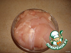 Куриное филе режем на полоски, отбиваем. Солим, перчим.