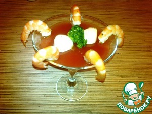 Для второй закуски необходим вкусный томатный сок. У меня свой, домашнего приготовления. Слегка нагреваем сок, добавляем 2-3 столовых ложки лимонного сока и распускаем в нем предварительно подготовленный желатин. Наливаем в бокалы. Убираем в холодильник.