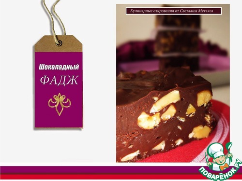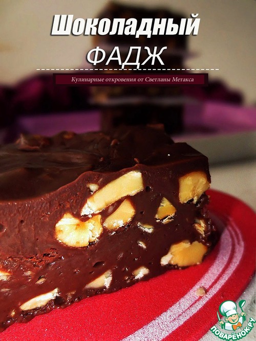 Лакомство для фанатов шоколадно-орехового вкуса!!! Фадж - это шоколадная помадка. Фадж готовят как из темного шоколада, как у меня, так и из молочного, белого. Также не исключено использование какао-порошка, в качестве ароматизатора ванилин. В фадж можно добавить любые орехи, изюм. Можно приготовить двухцветный фадж, вообщем простор для экспериментов. Этот прекрасный десерт обладает фантастическим вкусом и очень красивым внешним видом!