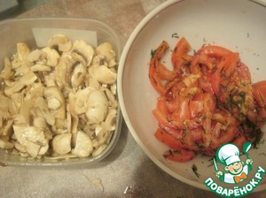 Замариновать в ней на минут 15 шампиньоны, в помидоры накрошить зелени