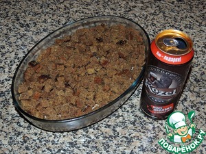 Фольгу снять и держать мясо к духовке еще 15 минут до поджаривания хлеба. При этом нижняя часть хлебных кубиков пропитывается пивом и образует соус, а верхняя - аппетитную корочку.