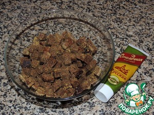 Ржаной хлеб порезать сантиметровыми кубиками. Мне нравится в этом блюде хлеб с ярким вкусом, например, "Бородинский"; я использовала 8 ломтиков. Добавить горчицу и перемешать (количество горчицы определяется ее остротой!).