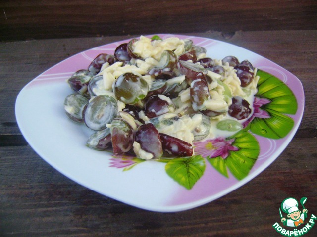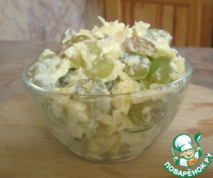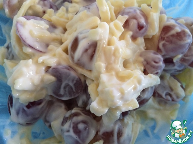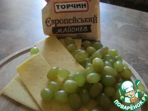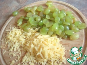 Сыр натереть, виноградина разрезать пополам