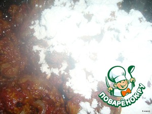 Всыпать муку, перемешать и обжаривать несколько минут.