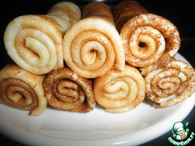 Разогреть сковороду с растительным маслом (я делаю в блиннице) и обжарить блины с двух сторон (размер у блинов может быть любым..)