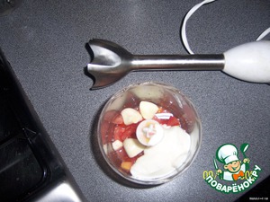 Мякоть помидора положим в блендер маленький, добавим чеснок и пару ложечек натурального йогурта. Прокрутим и получим легкий соус. Добавим соль