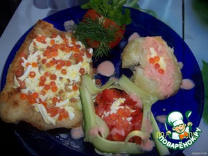 Выложим на тарелочку рыбку, корзиночку, запеченную картошечку, порежем огурчик и перчик, польем соусом. Оставшиеся соусы двух видов подадим отдельно. Нальем пивка и... начнем есть и сплетничать)))