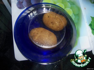 Вымоем две картофелины, положим на тарелочку, сверху прикроем (это обязательно!!) и поставим в микроволновку на максимальную мощность. У меня макс. мощность 750 ватт и стояли 8 минут.