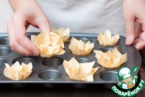 Я заранее испекла вот такие тарталетки из теста фило - нарезала лист фило на квадратики, сложила по 2-3 штуки и заполнила форму для капкейков. Выпекать при 180 С до готовности, примерно 20 минут. Вместо таких тарталеток можно использовать покупные.