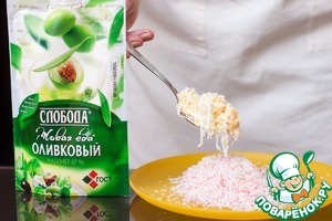 Замороженное крабовое мясо натереть на мелкой терке. 1/3 отложить для украшения.