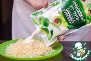 На мелкую терку натереть твердый сыр, добавить к предыдущим ингредиентам, выравнять на соль-перец и смешать с майонезом и измельченным чесноком