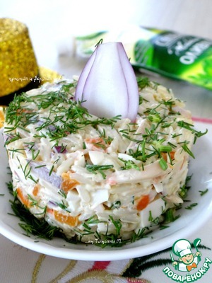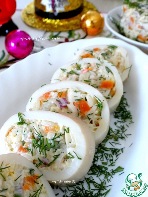 Наверное ни один новогодний стол не обходится без салата с крабами, крабовыми палочками или кальмарами с рисом под майонезом... Состав ингредиентов свой у каждой хозяйки, я вам предлагаю такой вариант приготовления и подачи! Очень симпатично и вкусно!