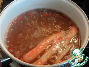 Вынуть кальмары из воды, воду снова довести до кипения и выложить в воду крабовое мясо;
