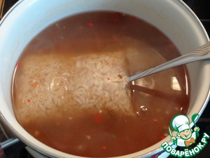 Третий раз довести воду до кипения, заложить в воду пакет с рисом и готовить столько, сколько предполагает инструкция на упаковке (рис получается с очень насыщенным морепродуктовым вкусом!);