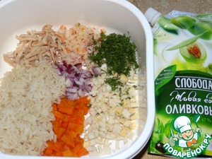 Добавить остывший готовый рис, заправить майонезом - перемешать; -