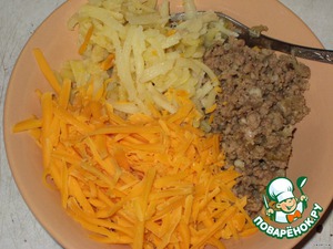 Для начинки обжаренный фарш с луком, смешать с натертым картофелем и тертым сыром, перемешать.