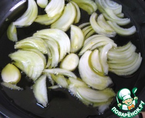 В сковороду налить 75 мл масла, чеснок очистить, нарезать пластинками и жарить в масле.