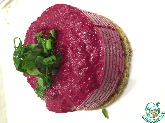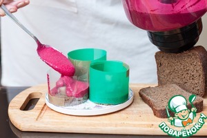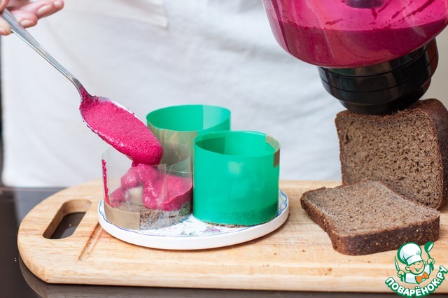 Если у вас есть высокие металлические кольца для десертов - прекрасно! Вырежьте ими хлебные заготовки и так и оставьте - потом заполните муссом. Если же нет - не беда! Канцелярские файлы вам в помощь. Места стыков скрепите при помощи скотча или степлером. Наденьте формы на хлебные донышки и залейте свекольным муссом. Уберите в холод на час. Если подавать планируете на след. день, снимайте кольца только перед подачей, иначе края мусса заветрятся и потемнеют. Можно смазать верх тонким слоем раст. масла.