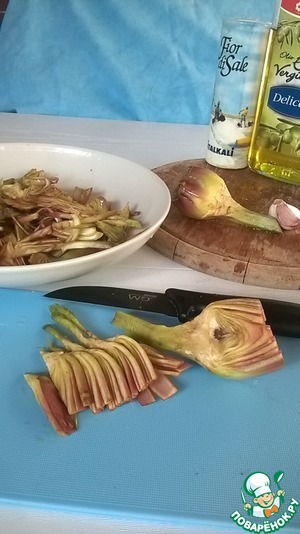 С 4 артишоков снять грубые верхние листья. обрезать колючки на верхушке. Чтоб не потемнели пока вы будиде чистить следующий, опускайте в холодную подкисленую воду.