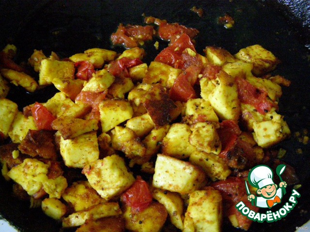 • Крупно нарезаем помидоры, солим, перчим и добавляем асафетиду или чеснок. Ломти вынимаем и режим кубиками, кидаем обратно и обжариваем их до золотисто-коричневой корочки, смешиваем с помидорами, солим, перчим, немного томим. Блюдо готово.