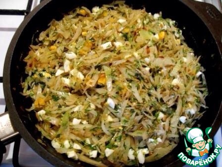 В готовую капусту кладем яйца и перемешиваем. Пока капуста жарится, готовим тесто.