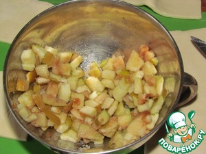 Затем измельчаем яблоки на кубики и перемешиваем с сахаром.