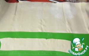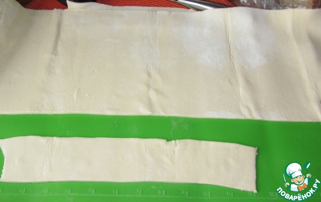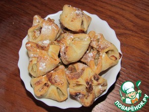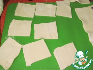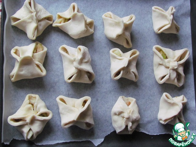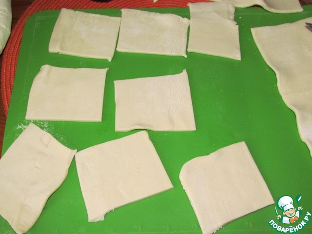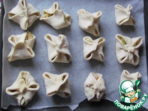 Тесто нарезаем квадратами приблизительно 5Х5 см. Кладем в середину начинку. Противоположные уголки поднимаем вверх и скрепляем их.