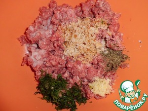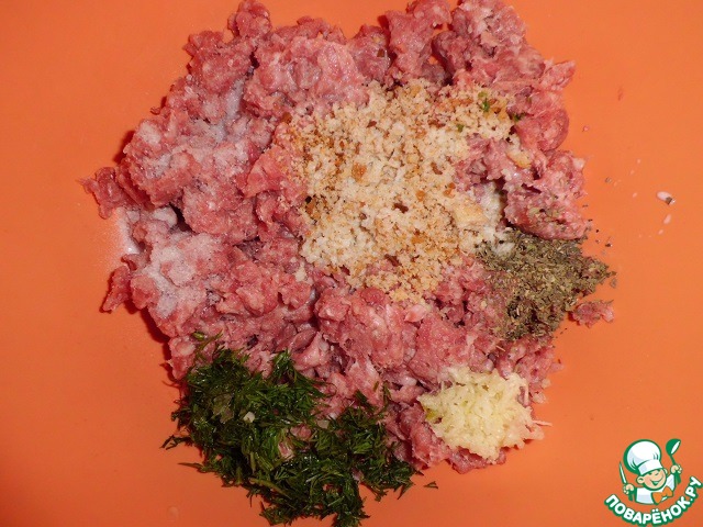 В фарш добавляем чеснок, зелень, базилик, молоко, соль и 1 ст. л. панировочных сухарей. Тщательно вымешиваем.