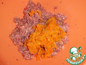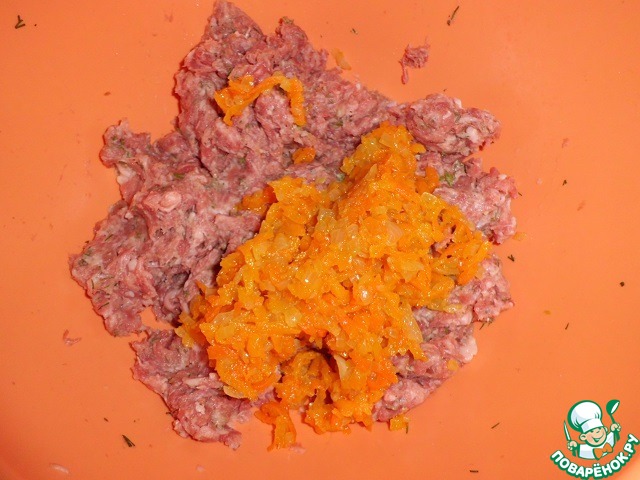 Добавляем в фарш, немного остывшие, пережаренные морковь и лук. Вымешиваем.