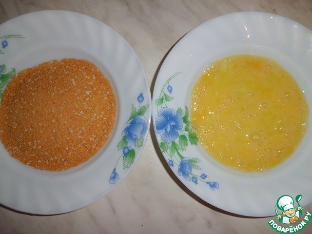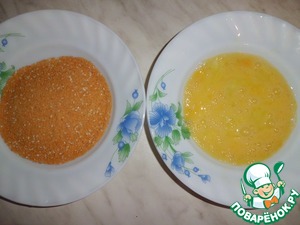 Подготавливаем 2 тарелки. В одной у нас панировочные сухари (панировочная смесь), в другой - взбитое яйцо.