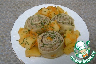 Не могу назвать это рецепт новинкой и вариантов здесь множество, скорее способ приготовления. Лично мне в подобных блюдах всегда не хватает начинки. Больше положишь - там развалилось, там не уместилось, меньше - сплошное "тесто" и никакого удовольствия. Думала я, думала и вот что получилось. Вариант для тех, кто любит, ну очень много, начинки, прошу...)))