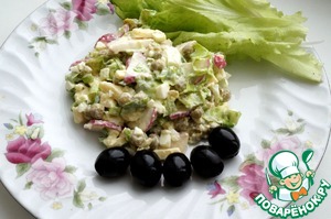Вот такой рецептик я нашла в интернете. Кулинар Sleepy утверждает, что данный салат относится к английской кухне, поэтому вместо длинного названия"Салат с сыром, редисом и зеленым горошком" я назвала его очень коротко "Английский ". Не могу сказать, что салат легкий, как никак сыр и майонез, но мне понравился, надеюсь понравится и вам.
