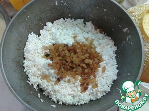 Соединить творог, с масляно-желтковой смесью, добавьте сметану, ванилин, изюм и рубленые орехи, перемешайте.