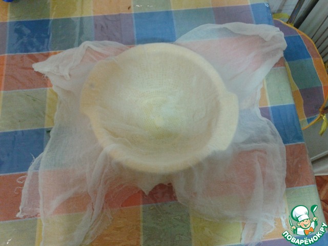 Необходимо переложить всю эту смесь в форму. Поскольку семья у меня большая, то стандартной формы, которую продают в церковных лавках, мне не хватает и я использую круглый такой дуршлаг, в который откидывают макароны. Отрезать достаточно большой кусок марли, сложить вдвое. Смочить в холодной воде, выстелить форму марлей, оставляя большие концы. -