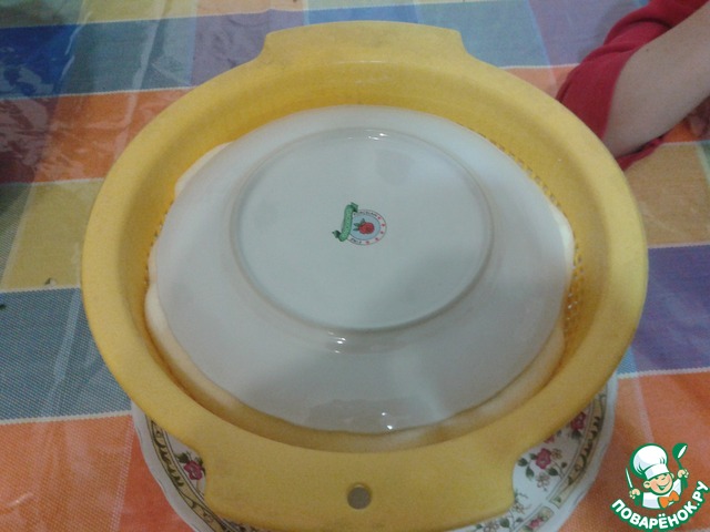 После прошествии этого времени, аккуратно развязываю концы марли, сверху накрываю блюдом, на котором вы подадите Пасху.