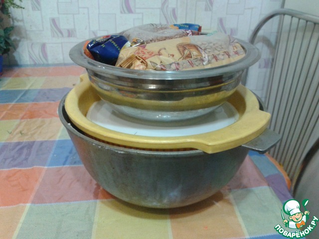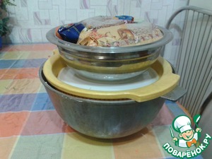 Гнёт. Достаточно двух пачек с крупой по 800 гр. Сито или дуршлаг ставлю в подходящую ёмкость, (в моё примере казан) таким образом чтобы дуршлаг не доставал до дна казана. Ставлю Всю эту конструкцию в холодильник на ночь, (или на 8 часов днем) чтобы стекла лишняя жидкость.