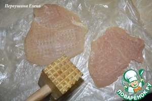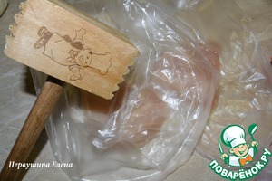 Мясо нарезать на порционные куски. Поместить в целлофановый пакет по 2 шт и отбить молоточком.