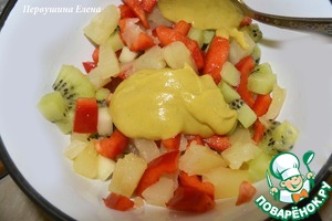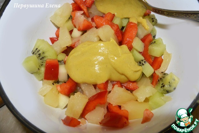 Кольца ананаса, болгарский перец и киви нарезать мелкими кубиками и сложить в миску.