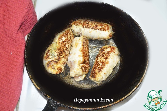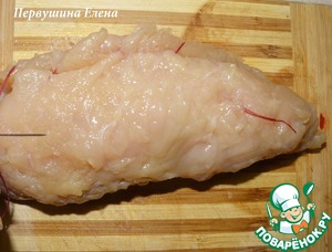 Сильно не усердствуйте, иначе начинка проткнет мясо. Посолить. поперчить и отложить пока в сторону.