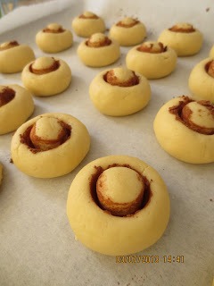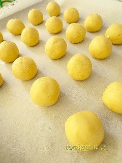 Разделить тесто на маленькие кусочки и скатать из них колобки. Противень застелить бумагой для выпечки и выложить колобки